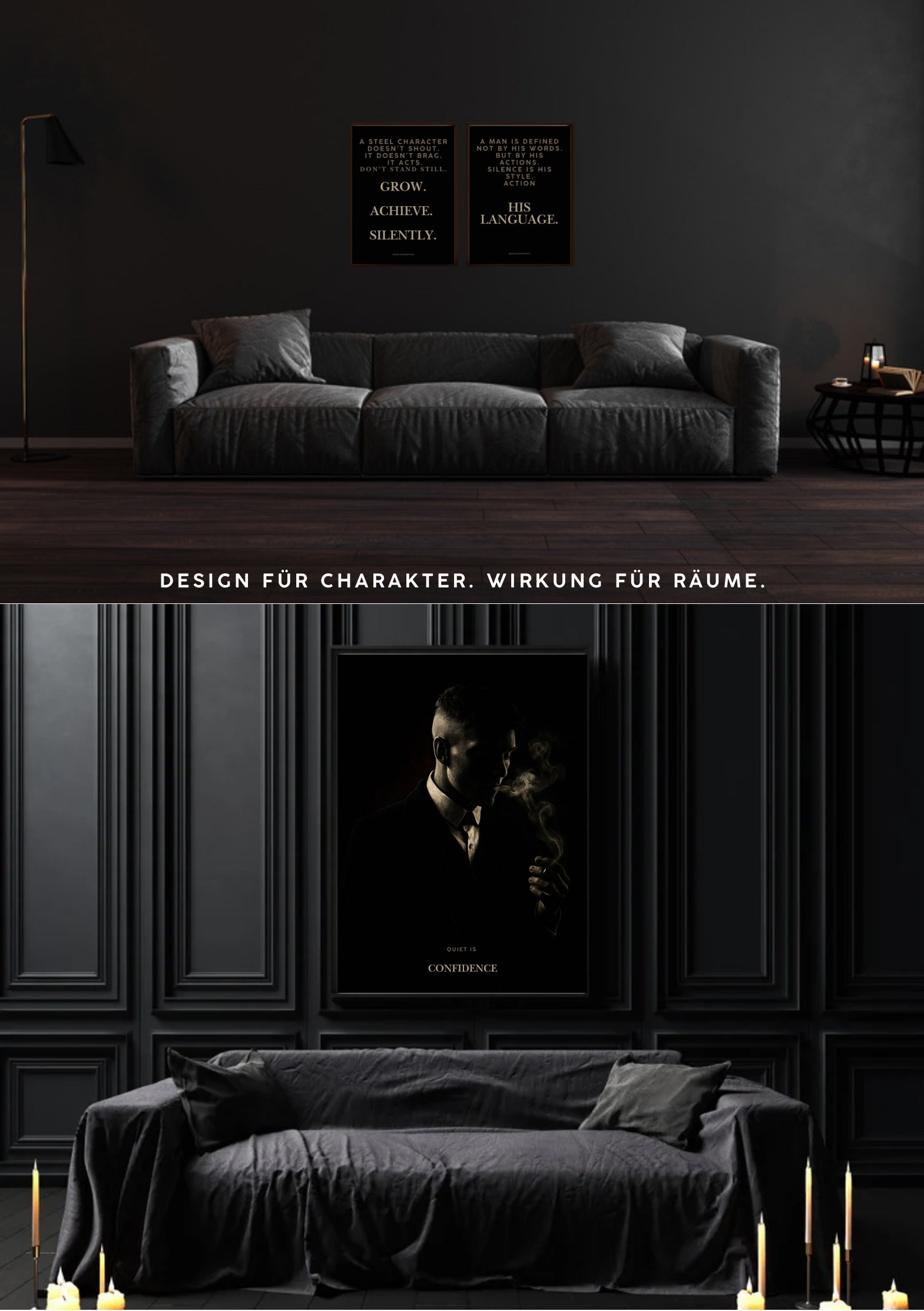Männer Wandkunst – Dunkles, maskulines Poster-Set – Motivation, Stil und Präsenz – PDF-Download, personalisierbar