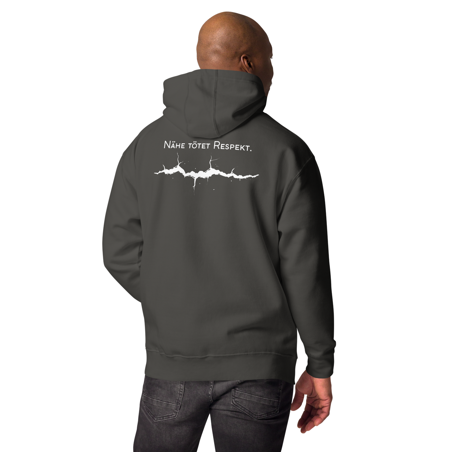 • Rückenprint: „Nähe tötet Respekt.“ + grafischer Riss